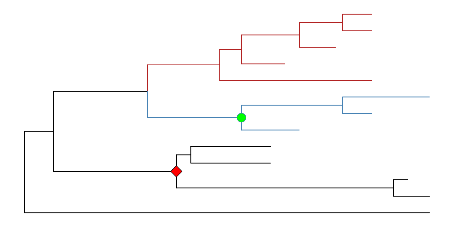 p1 <- p +geom_point2(aes(subset=node==16), color='darkgreen', size=5)p2 <-rotate(p1, 16)flip(p2, 17, 21)
