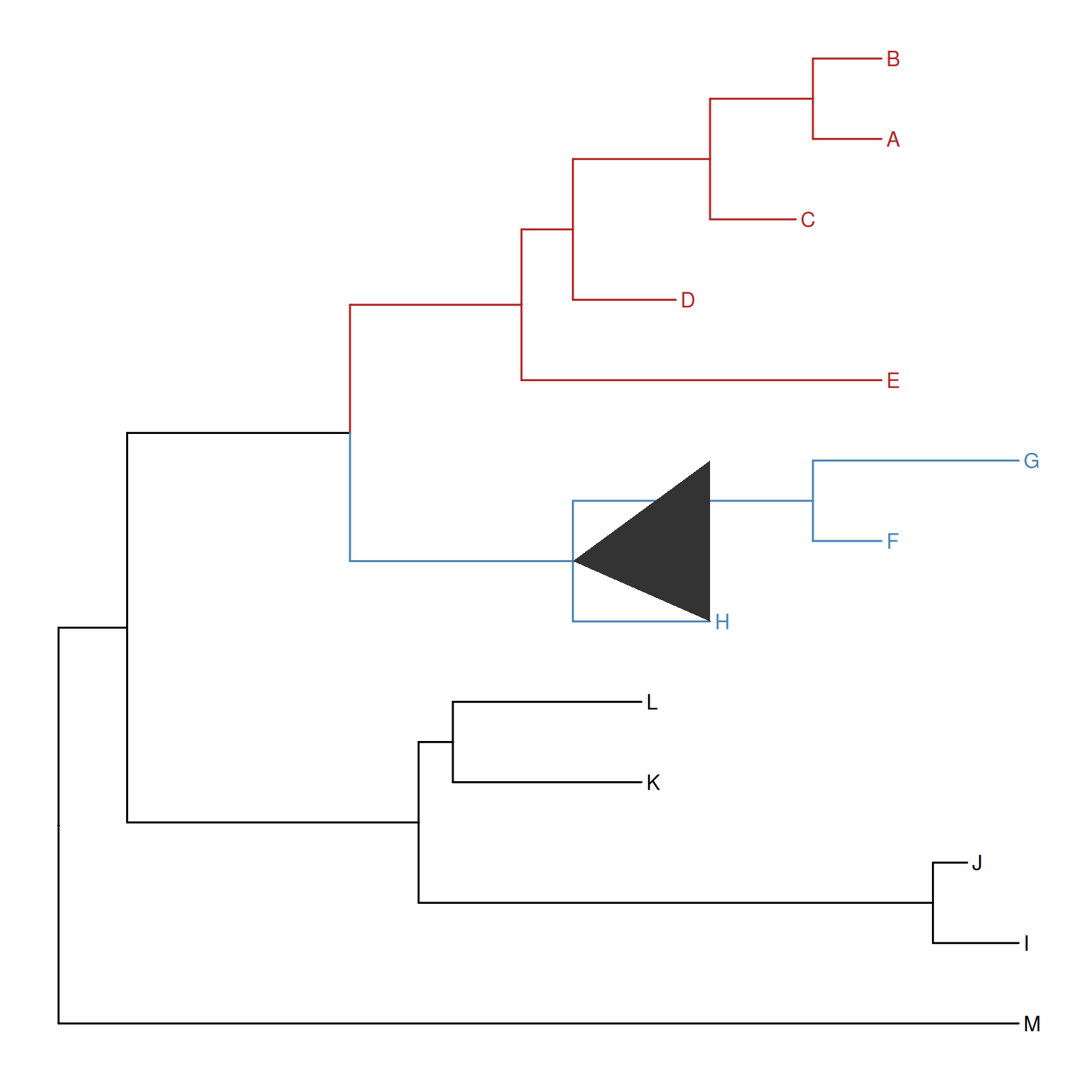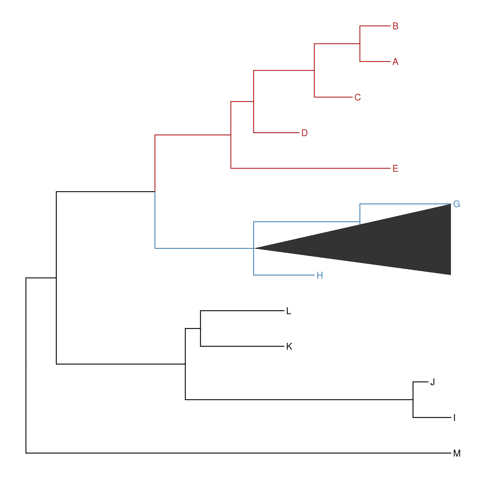 It is a common practice to prune or collapse clades so that certain aspects of a tree can be emphasized. The ggtree supports collapsing selected clades using the collapse() function as shown in Figure Figure 8.3 (a).