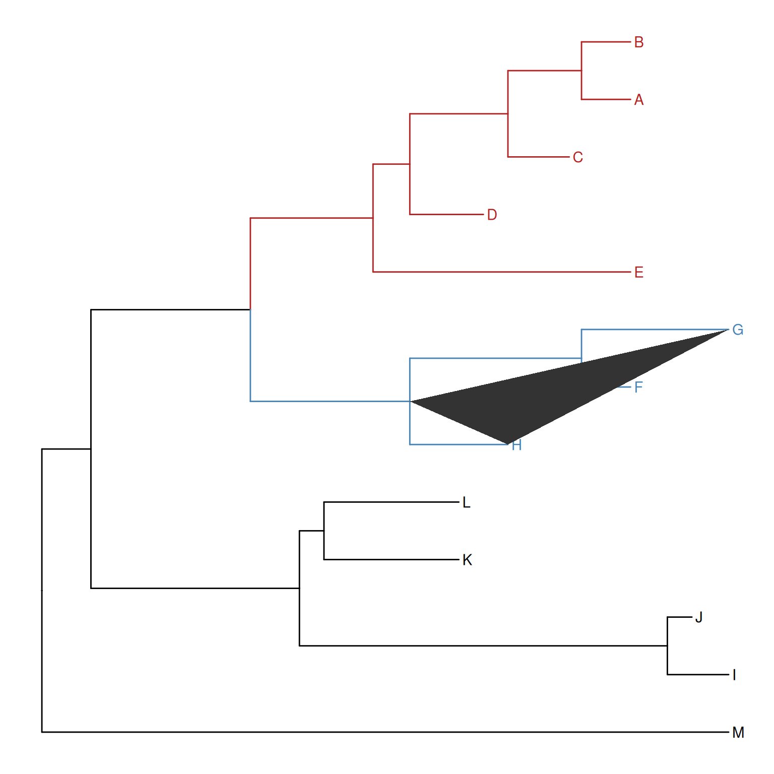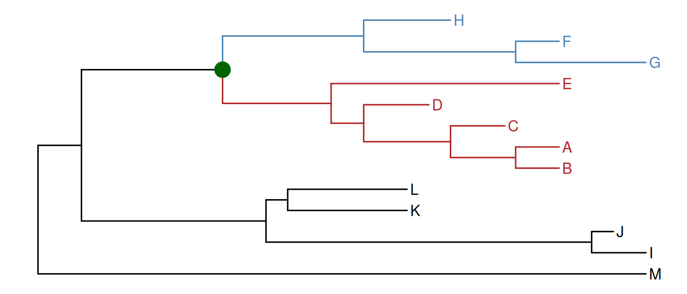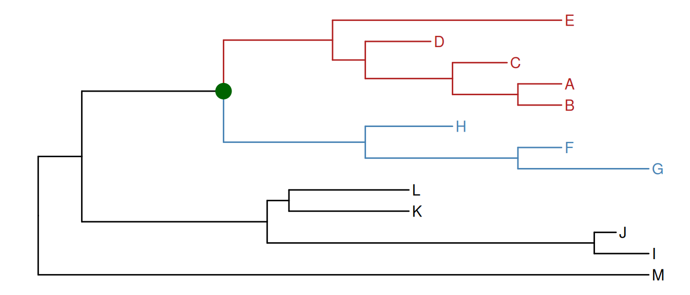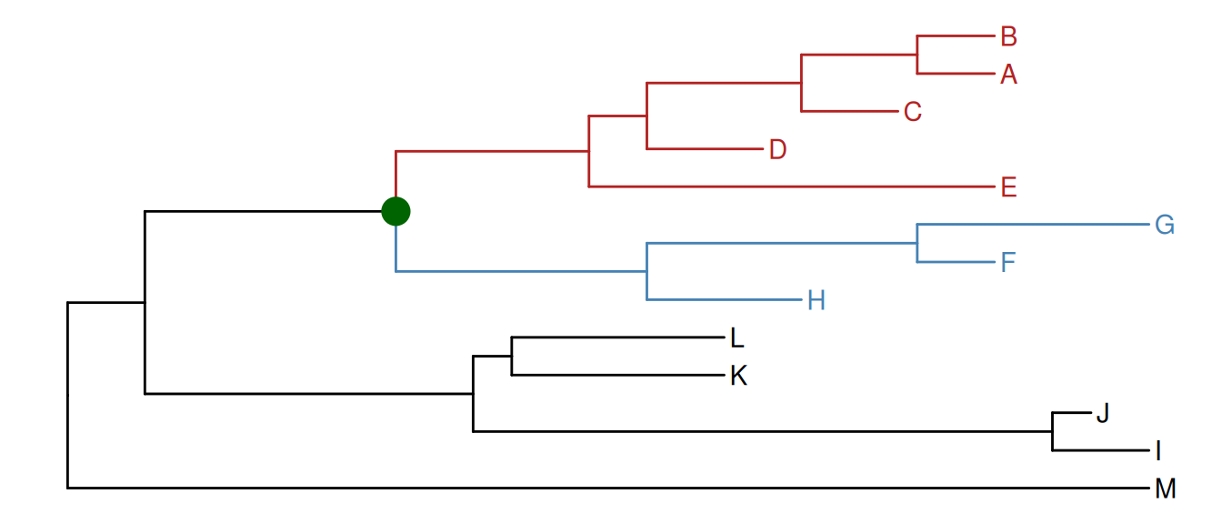 Similarly, the groupOTU() function assigns branches and nodes to different groups based on user-specified groups of operational taxonomic units (OTUs) that are not necessarily within a clade but can be monophyletic (clade), polyphyletic or paraphyletic. It accepts a vector of OTUs (taxa name) or a list of OTUs and will trace back from OTUs to their most recent common ancestor (MRCA) and cluster them together as demonstrated in Figure Figure 8.5.