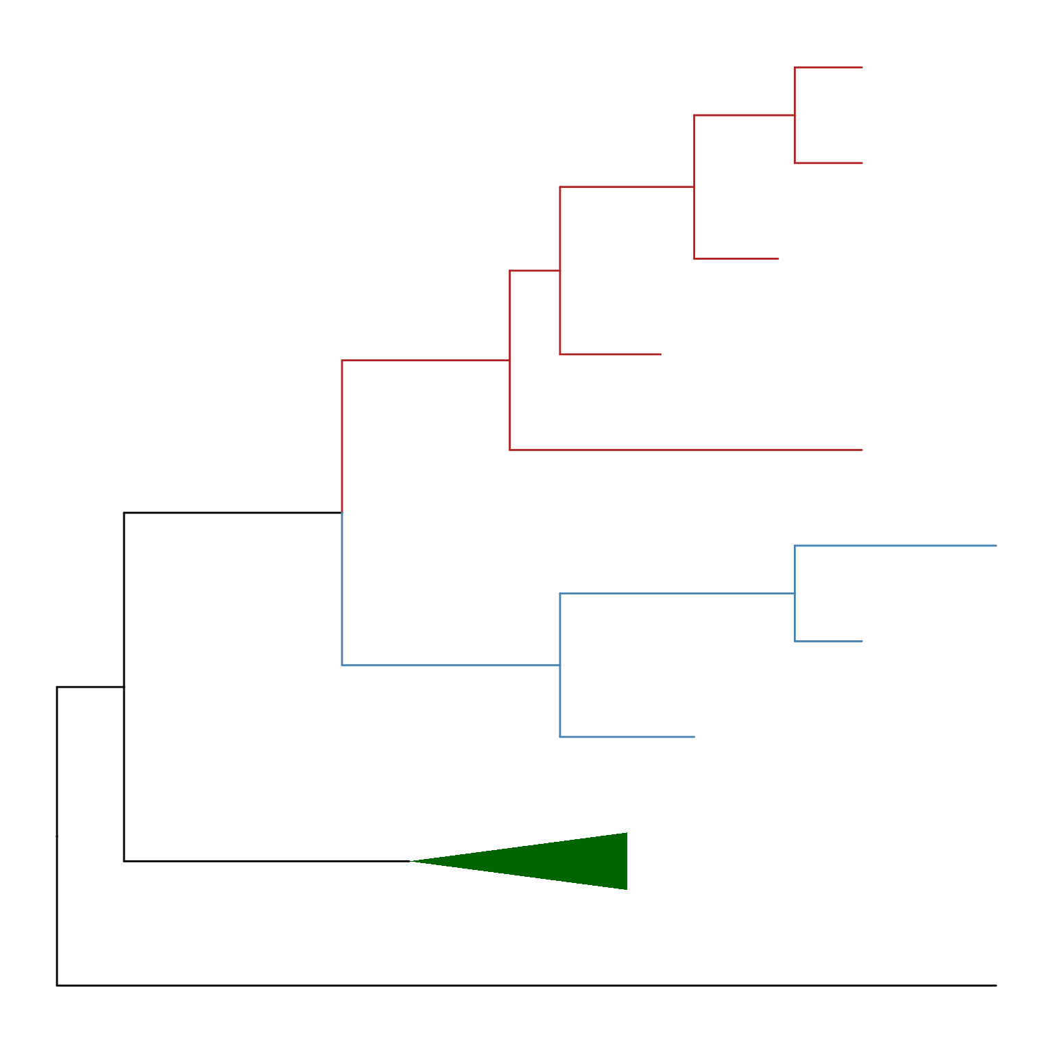 If users want to emphasize important clades, they can use the scaleClade() function by passing a numeric value larger than 1 to the scale parameter. Then the selected clade will be zoomed in. Users can also use the groupClade() function to assign selected clades with different clade IDs which can be used to color these clades with different colors as shown in Figure Figure 8.2.