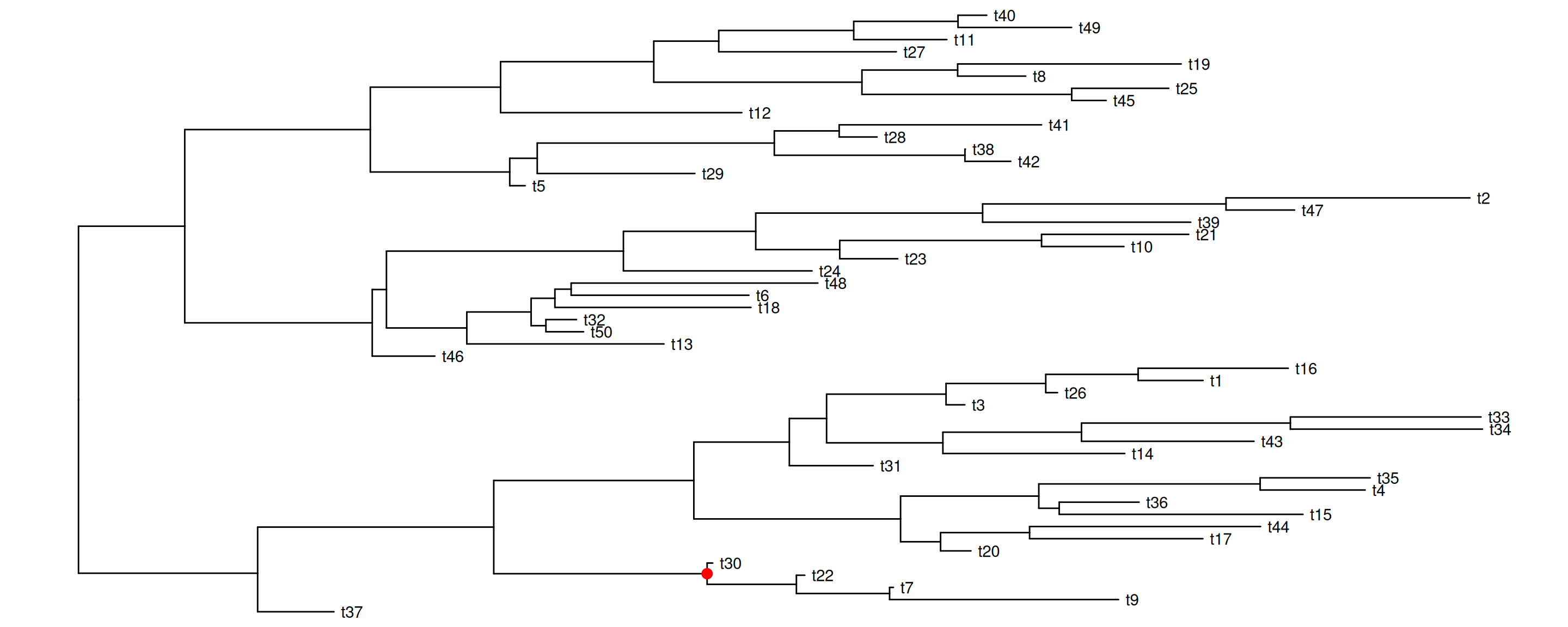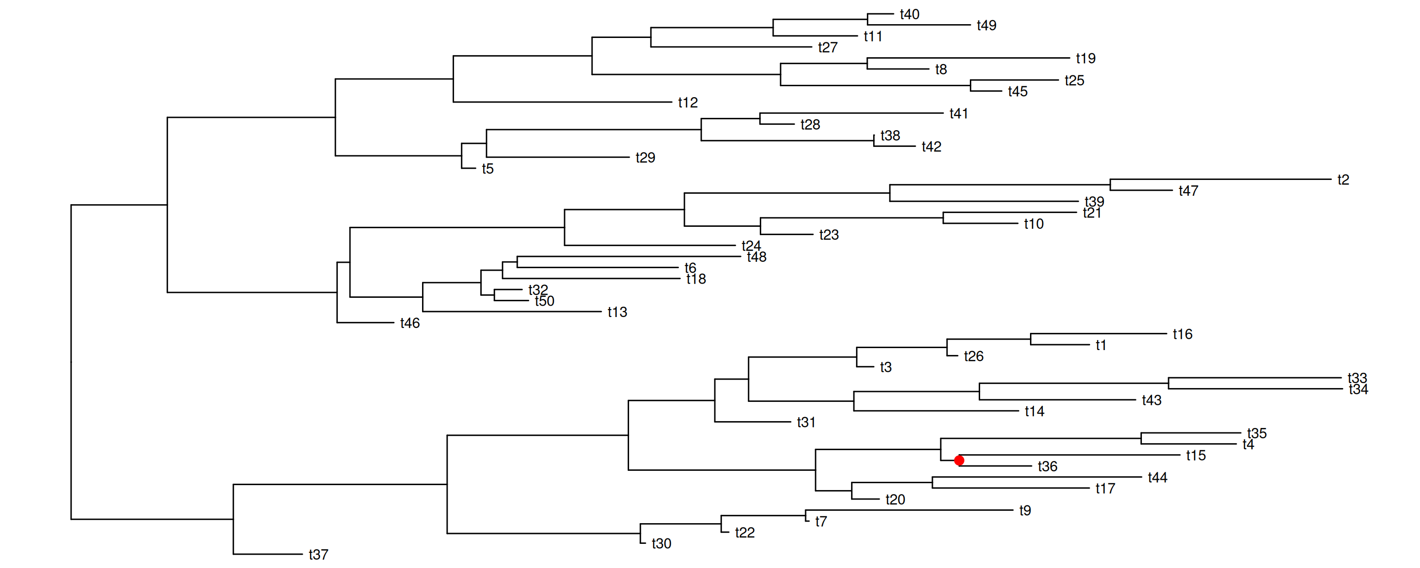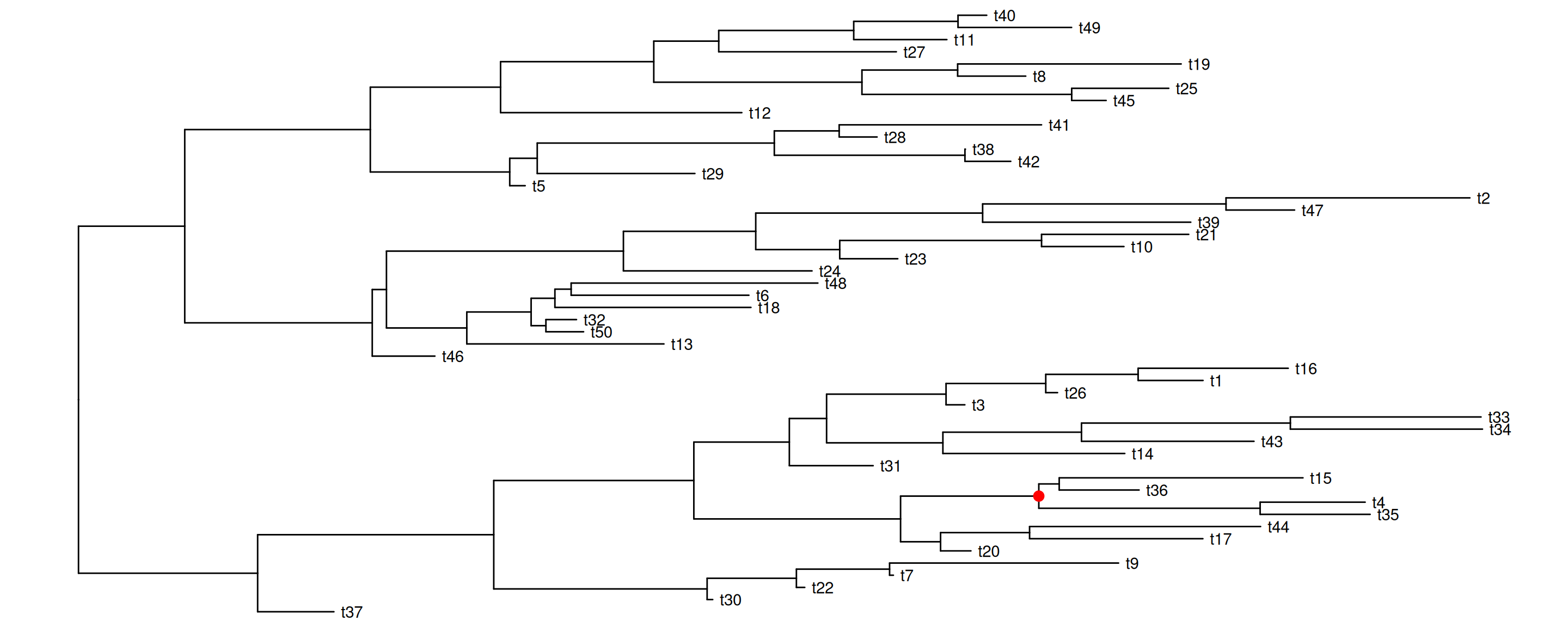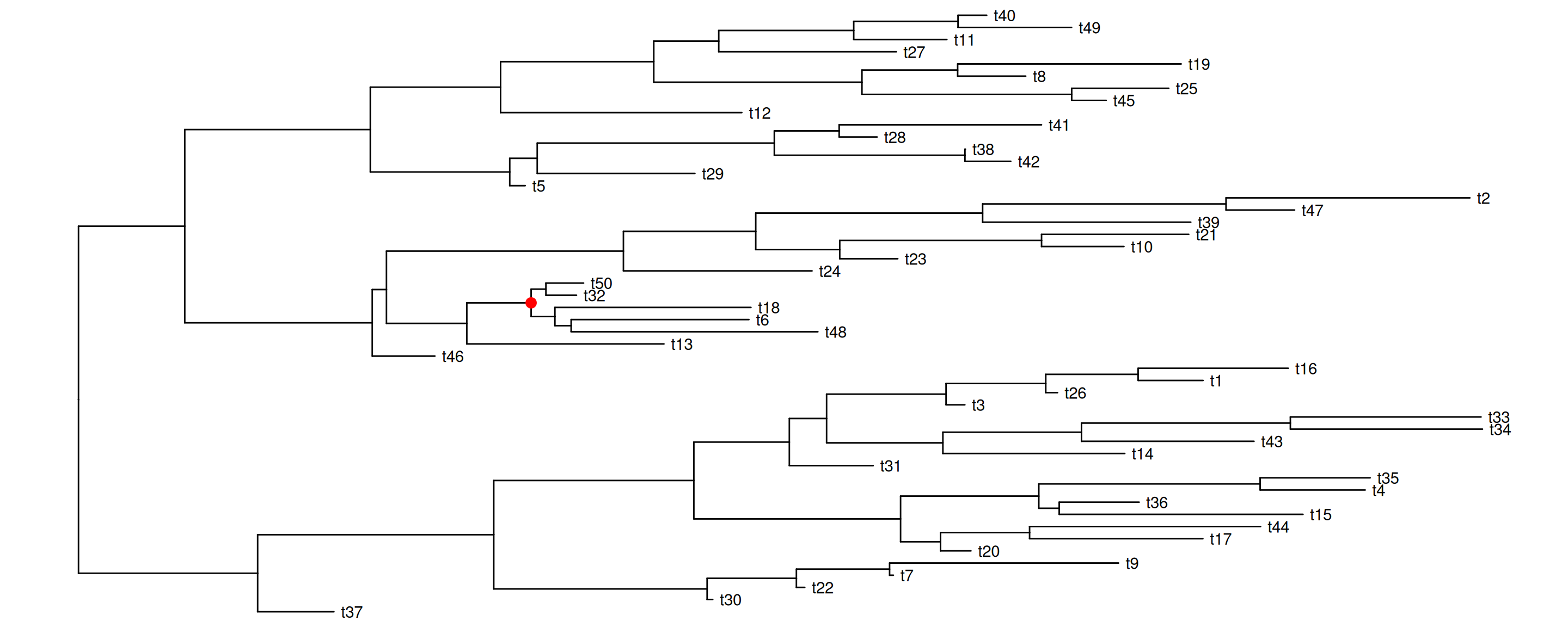 set.seed(2016-05-29)x <-rtree(50)p <-ggtree(x) +geom_tiplab()## nn <- unique(reorder(x, 'postorder')$edge[,1]) ## to traverse all the internal nodesnn <-sample(unique(reorder(x, 'postorder')$edge[,1]), 4)pp <-lapply(nn, function(n) { p <-rotate(p, n) p +geom_point2(aes(subset=(node == n)), color='red', size=3)})pp[[1]]pp[[2]]pp[[3]]pp[[4]]