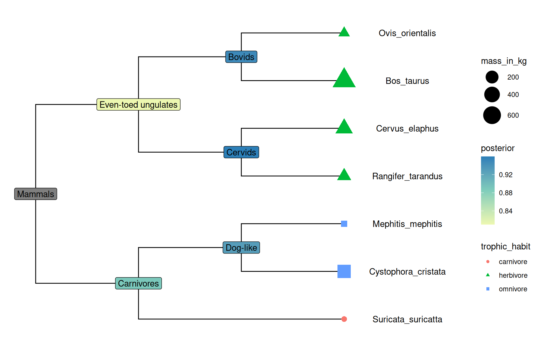 library(ggimage)library(ggtree)library(TDbook)# load `tree_boots`, `df_tip_data`, and `df_inode_data` from 'TDbook'p <-ggtree(tree_boots) %<+% df_tip_data +xlim(-.1, 4)p2 <- p +geom_tiplab(offset = .6, hjust = .5) +geom_tippoint(aes(shape = trophic_habit, color = trophic_habit, size = mass_in_kg)) +theme(legend.position ="right") +scale_size_continuous(range =c(3, 10))p2 %<+% df_inode_data +geom_label(aes(label = vernacularName.y, fill = posterior)) +scale_fill_gradientn(colors = RColorBrewer::brewer.pal(3, "YlGnBu"))