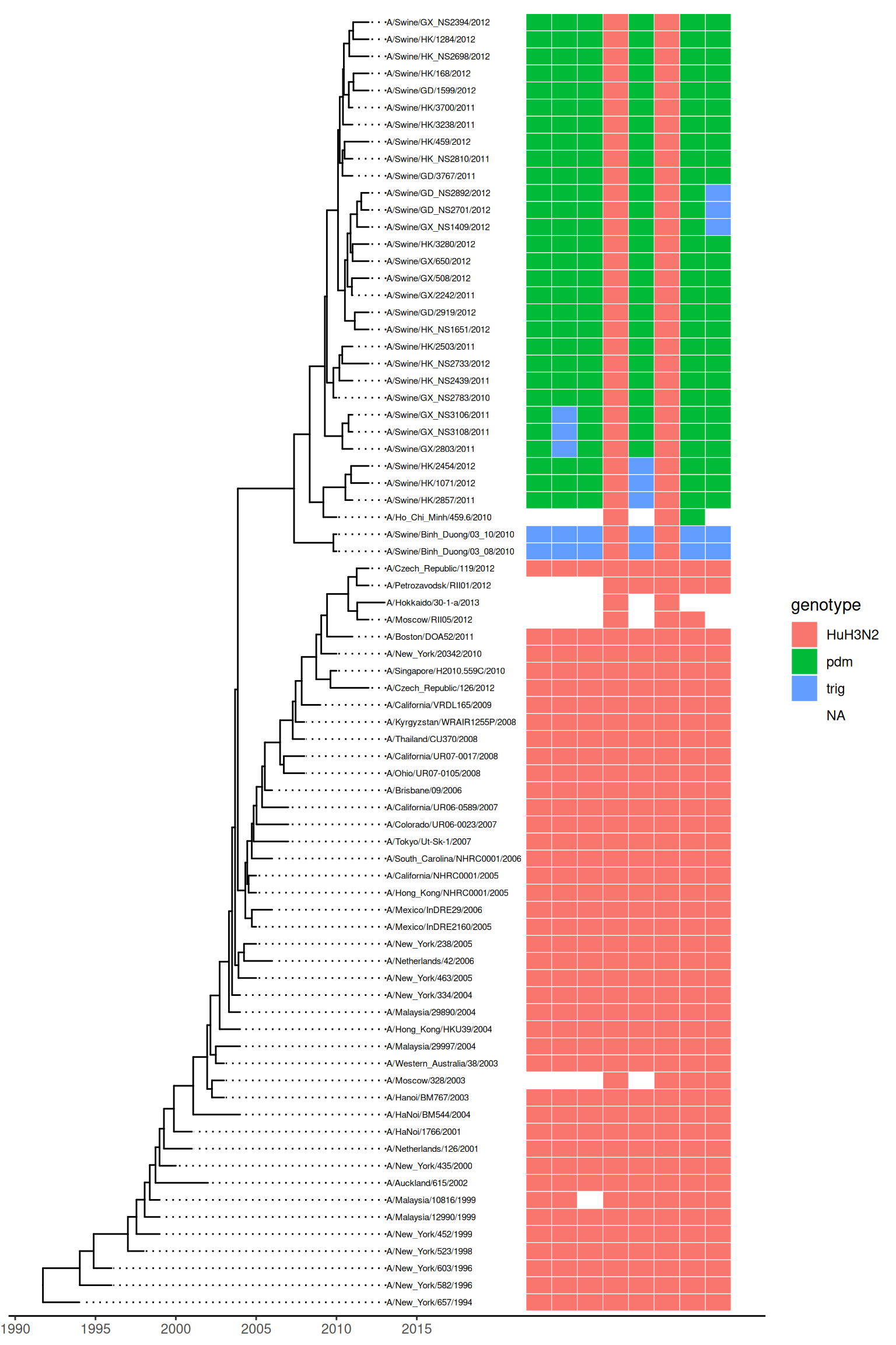 In the following example, we visualized a tree of H3 influenza viruses with their associated genotypes (Figure Figure 9.3 (a)).