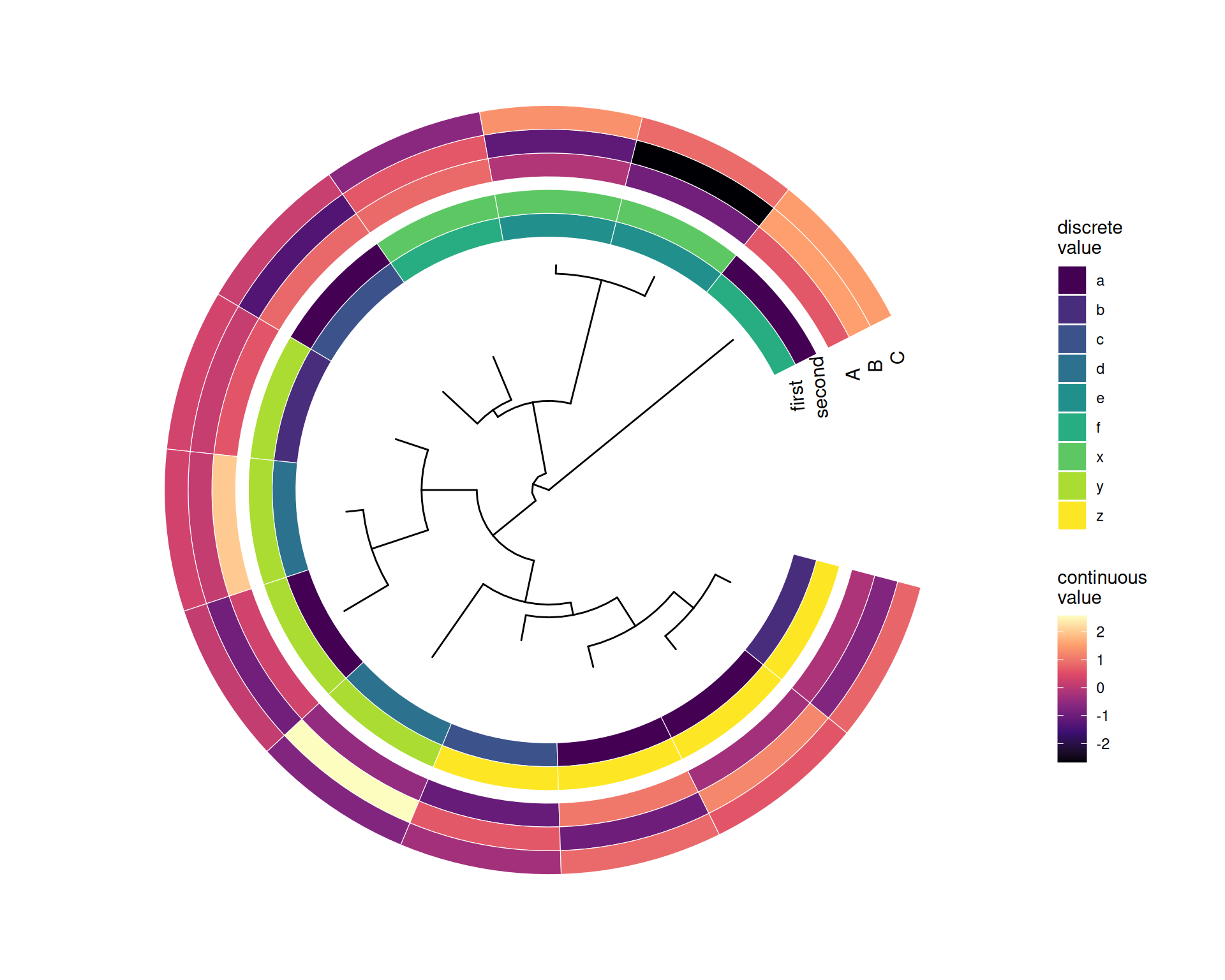 Figure 9.4: Example of plotting multiple matrix with gheatmap(). A data frame (with ‘first’ and ‘second’ columns) was visualized as a discrete heatmap and another data frame (with ‘A’, ‘B’ and ‘C’ columns) was visualized as a continuous heatmap with corresponding discrete and continuous palette of colors (Figure Figure 9.4).