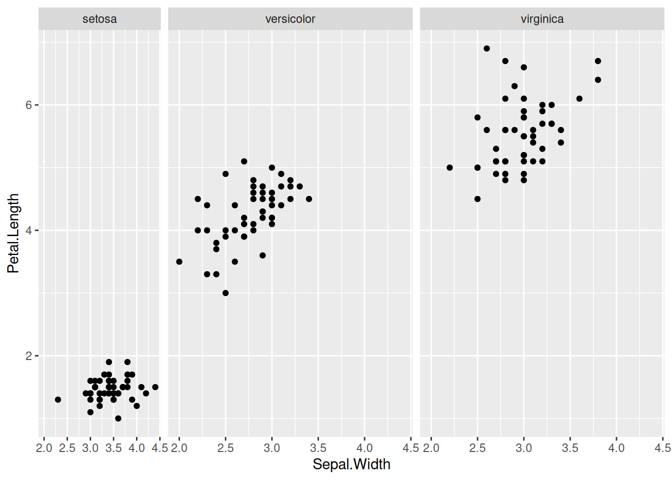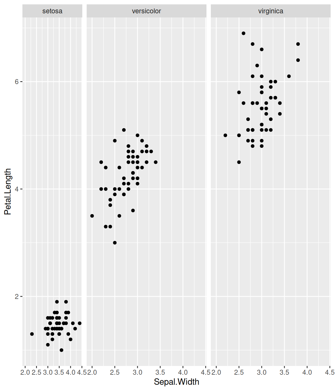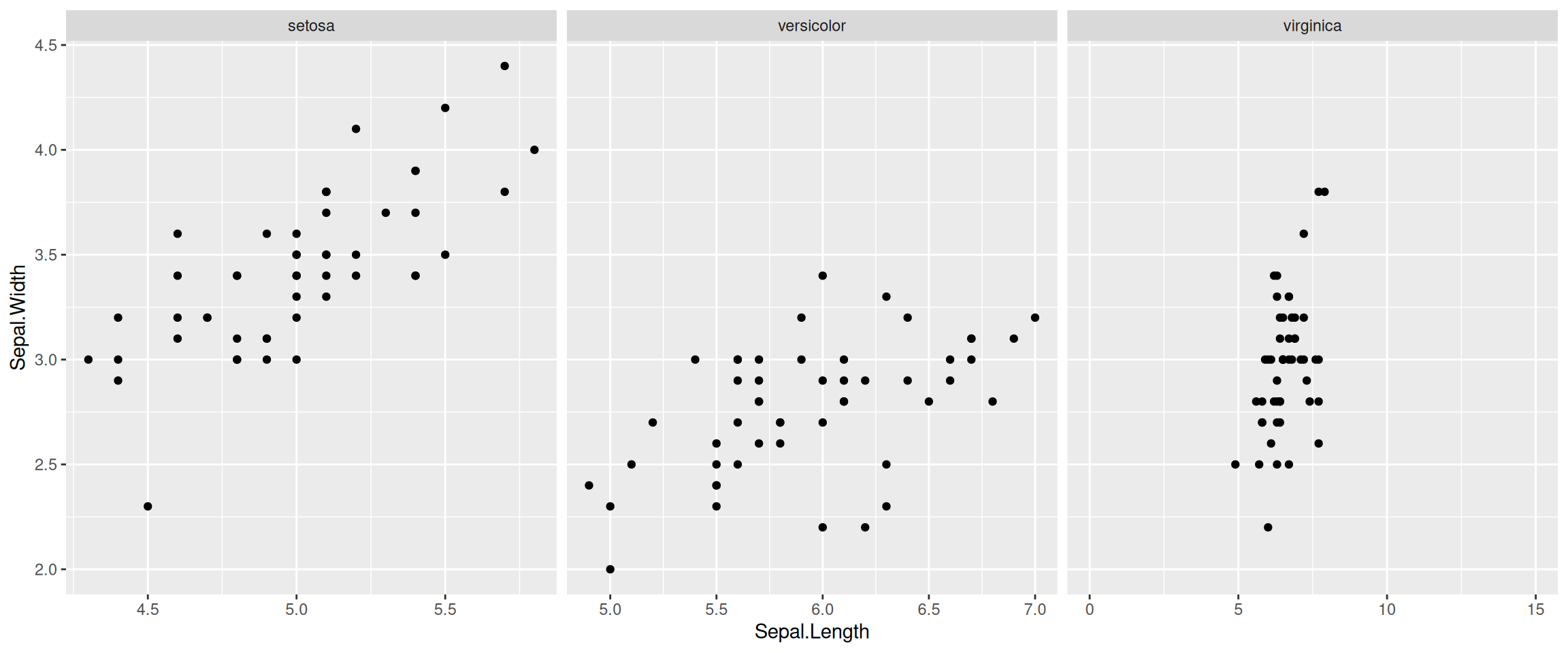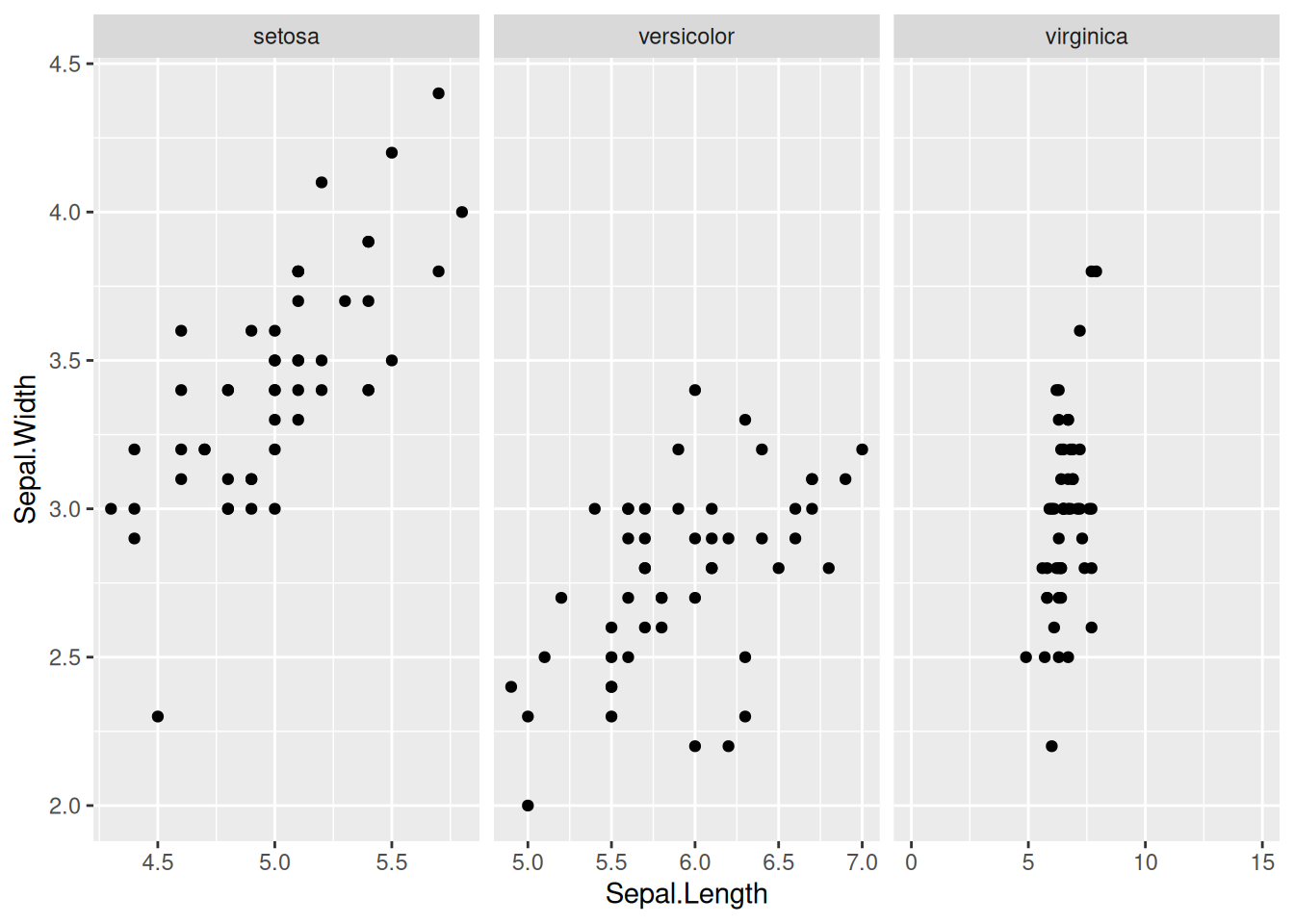 geom_point() + facet_grid(. ~ Species, scales = "free_x")