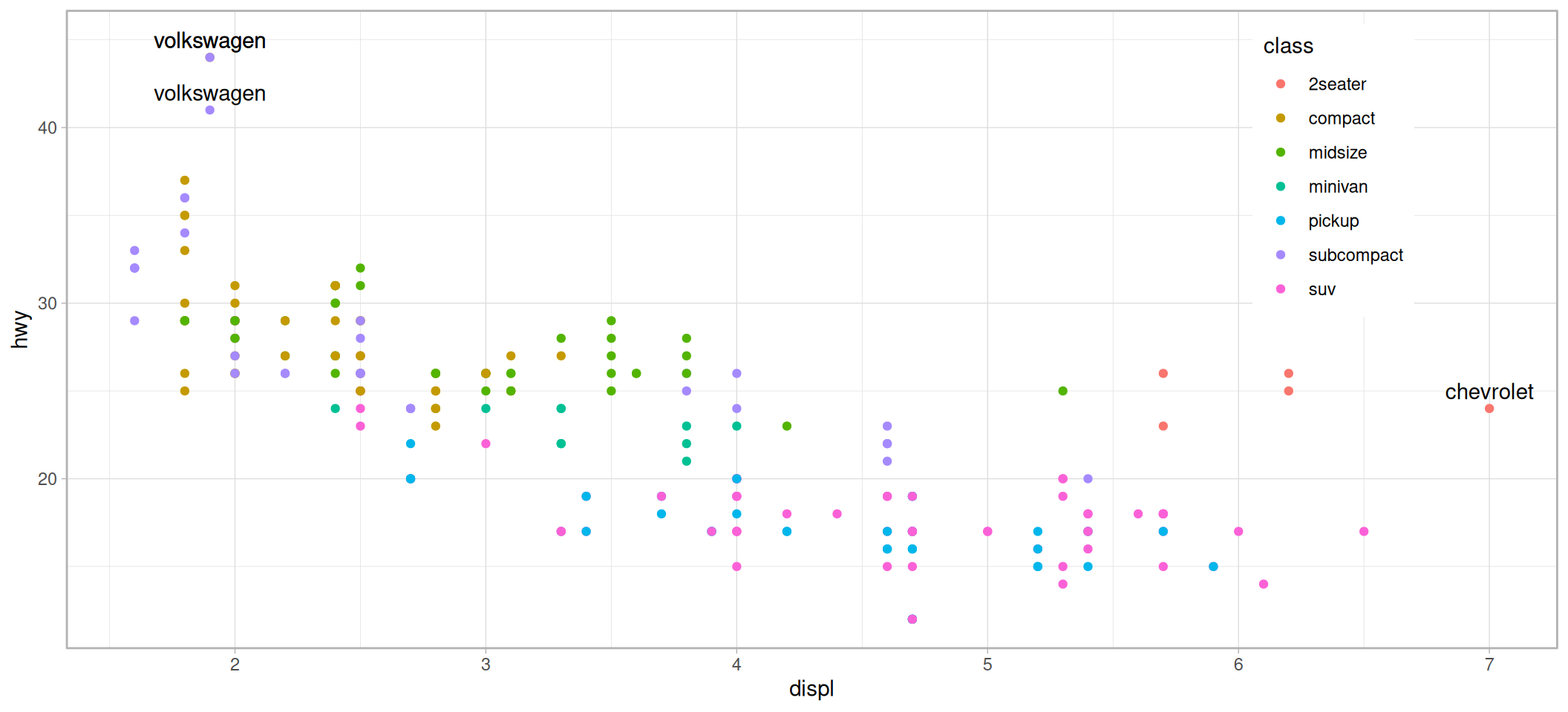 p <- ggplot(data = mpg, mapping = aes(x = displ, y = hwy)) +