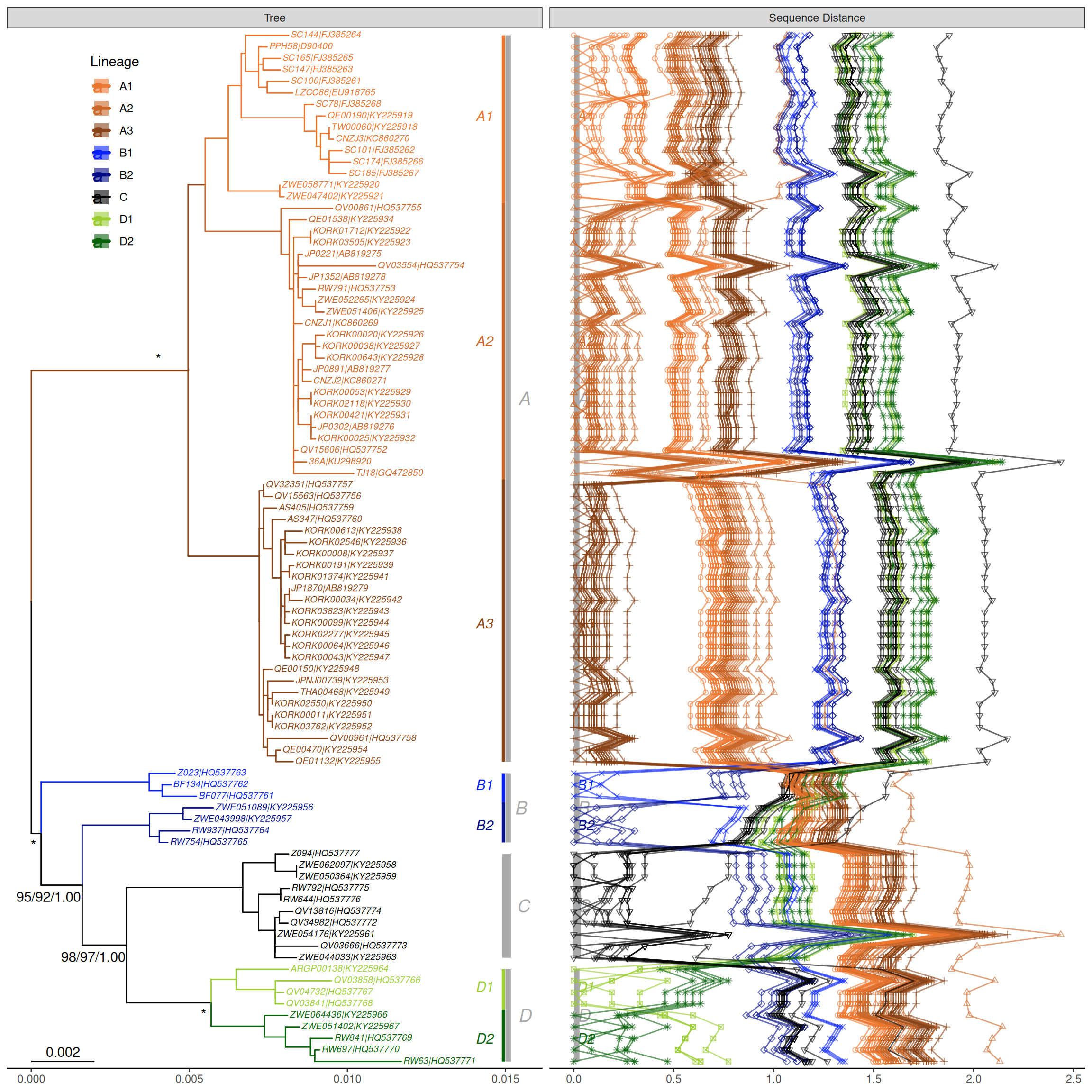 This example reproduces figure 1 of (Chen et al., 2017). It extracts accession numbers from tip labels of the HPV58 tree and calculates pairwise nucleotide sequence distances. The distance matrix is visualized as dot and line plots. This example demonstrates the ability to add multiple layers to a specific panel. As illustrated in Figure Figure 15.1, the geom_facet() function displays sequence distances as a dot plot and then adds a layer of line plot to the same panel, i.e., sequence distance. In addition, the tree in geom_facet() can be fully annotated with multiple layers (clade labels, bootstrap support values, etc.). The source code is modified from the supplemental file of (Yu et al., 2018).