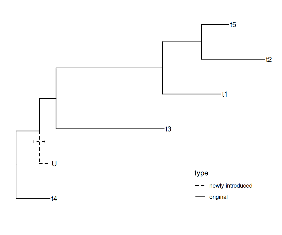 Users can use phytools::bind.tip()(Revell, 2012) to attach a new tip to a tree. With tidytree, it is easy to add an annotation to differentiate newly introduced and original branches and to reflect the uncertainty of the added branch splits off, as demonstrated in Figure Figure 1.9.