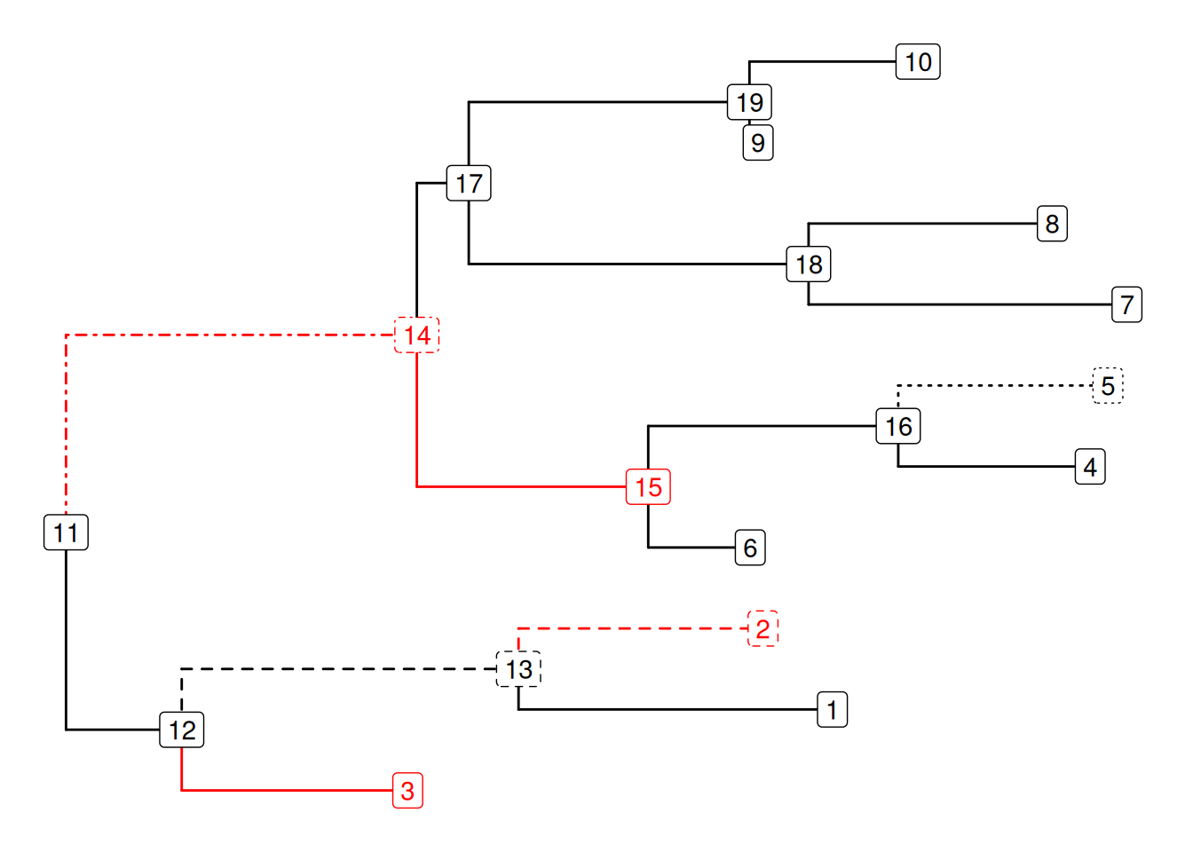 set.seed(123)x <-rtree(10)## binary choices of colorsd <-data.frame(node=1:Nnode2(x), colour ='black')d[c(2,3,14,15), 2] <-"red"## multiple choices of line typesd2 <-data.frame(node=1:Nnode2(x), lty =1)d2[c(2,5,13, 14), 2] <-c(2, 3, 2,4)p <-ggtree(x) +geom_label(aes(label=node))p %<+% d %<+% d2 +aes(colour=I(colour), linetype=I(lty))