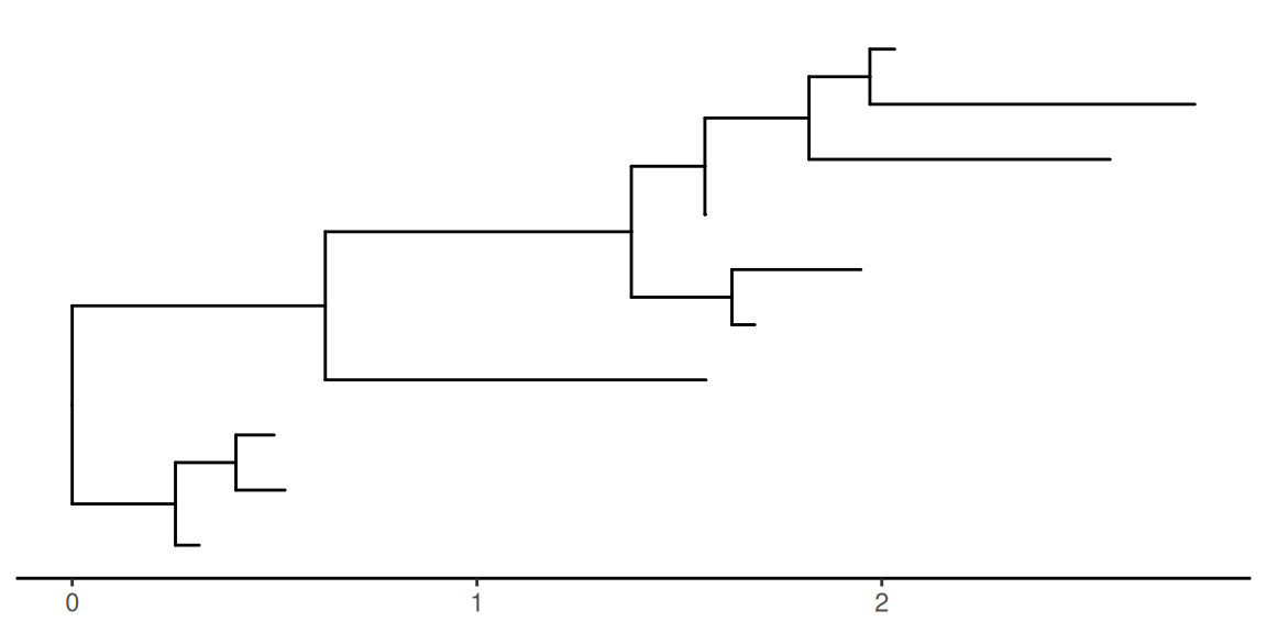 The revts() will reverse the x-axis by setting the most recent tip to 0. We can use scale_x_continuous(labels=abs) to label x-axis using absolute values (Figure Figure 1.15).