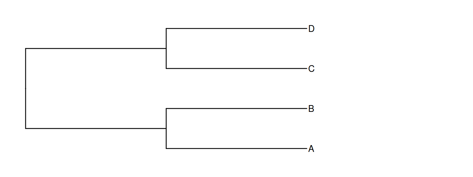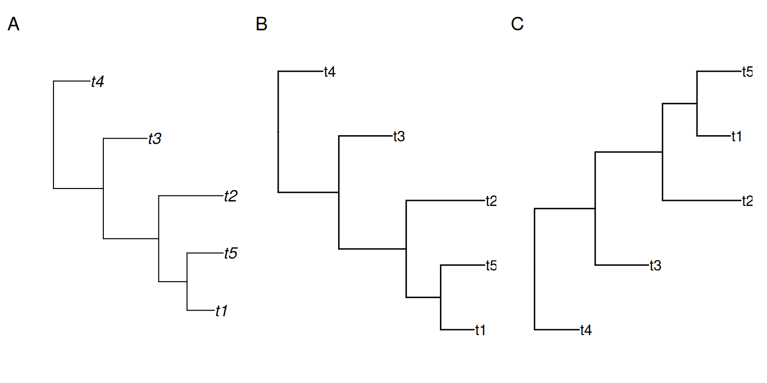 library(ape)library(ggtree)library(ggplotify)set.seed(2020)x <-rtree(5)#p1 <- as.ggplot(~plot(x))#p2 <- ggtree(x, ladderize = FALSE) + geom_tiplab()#p3 <- ggtree(x) + geom_tiplab()## don't know why throw error when combine them in bookdown## it is OK in interactive R terminal# plot_list(p1, p2, p3, ncol=3, tag_levels = 'A')