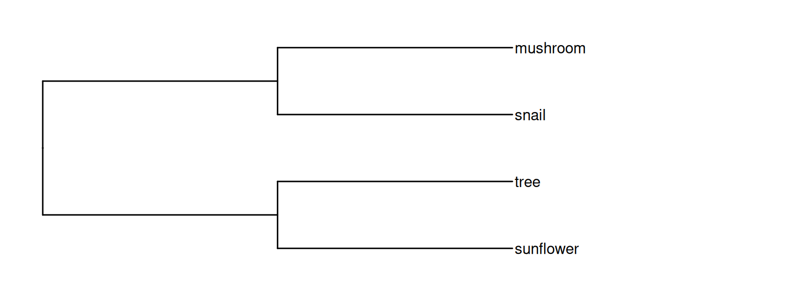 [1] "((sunflower,tree),(snail,mushroom));"