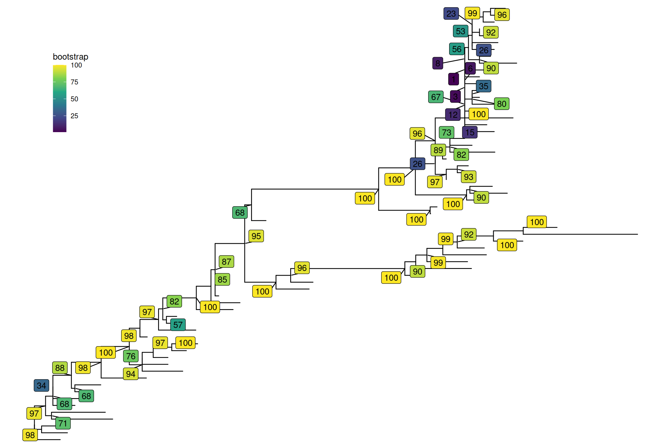 If you want to only display a subset of bootstrap (e.g., bootstrap > 80), you can’t simply use geom_text2(subset= (label > 80), label=label) (or geom_label2) since label is a character vector, which contains node label (bootstrap value) and tip label (taxa name). geom_text2(subset=(as.numeric(label) > 80), label=label) won’t work either, since NAs were introduced by coercion. We need to convert NAs to logical FALSE. This can be done by the following code: