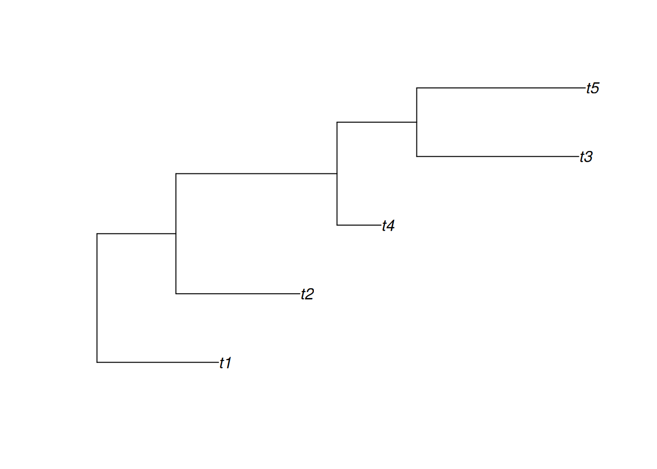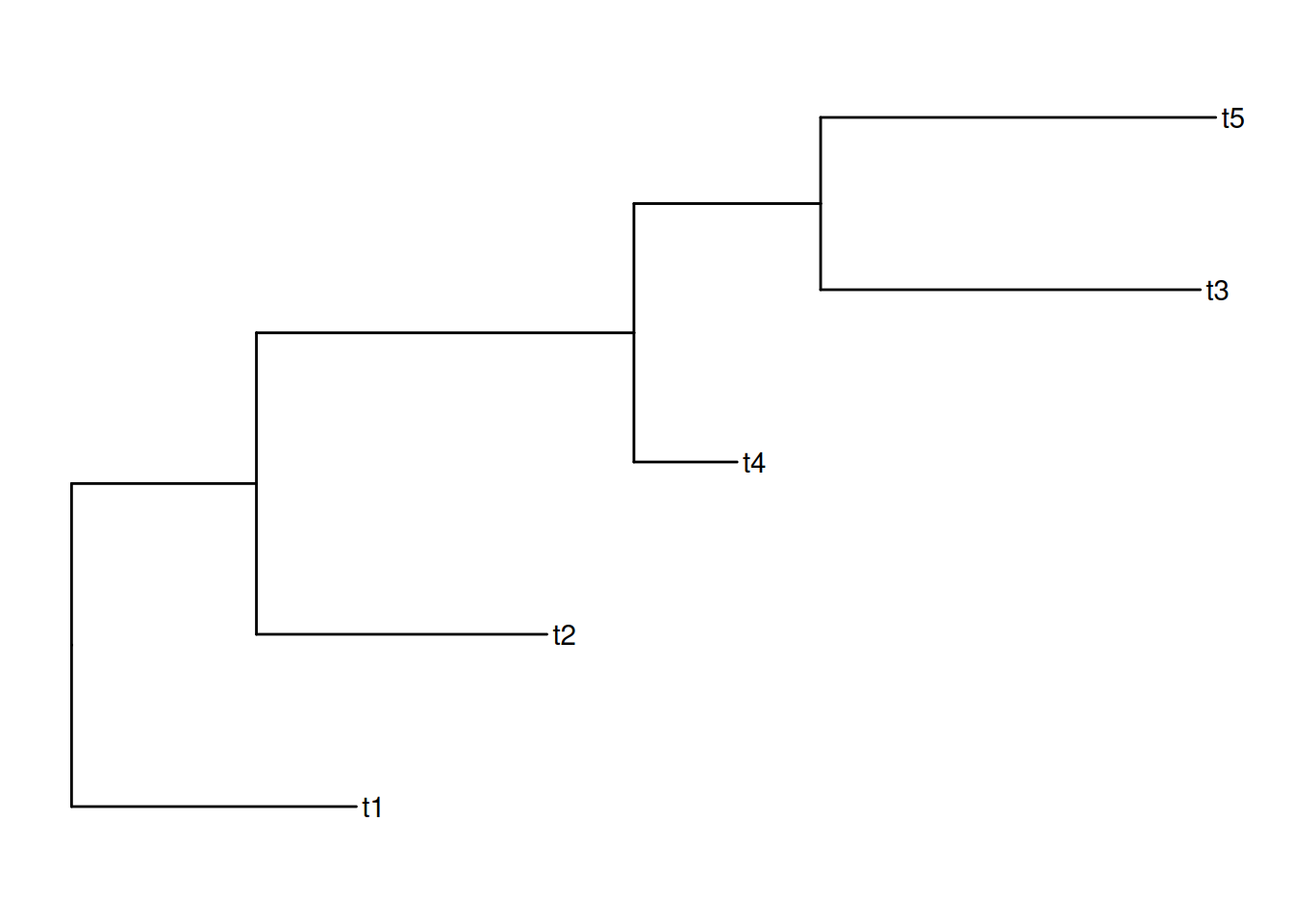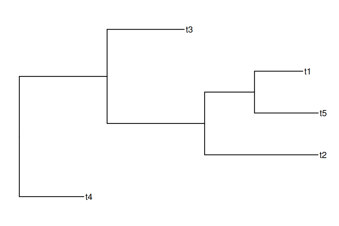 library(ggtree)set.seed(42)x <-rtree(5)plot(x)