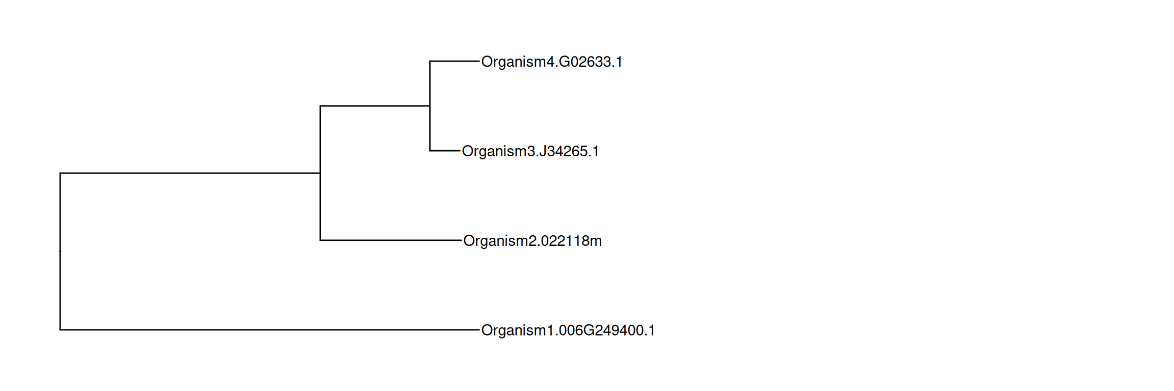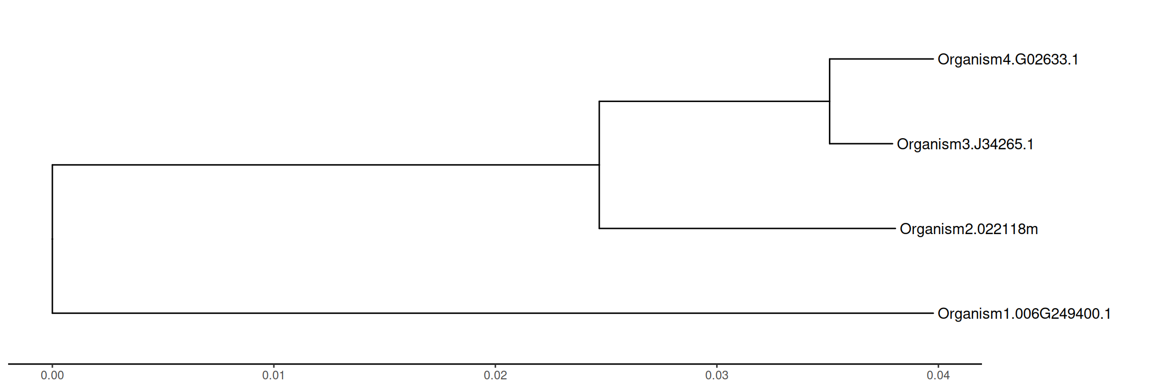 library(ggtree)## example tree from https://support.bioconductor.org/p/72398/tree <-read.tree(text=paste("(Organism1.006G249400.1:0.03977,", "(Organism2.022118m:0.01337,(Organism3.J34265.1:0.00284,","Organism4.G02633.1:0.00468)0.51:0.0104):0.02469);"))p <-ggtree(tree) +geom_tiplab()