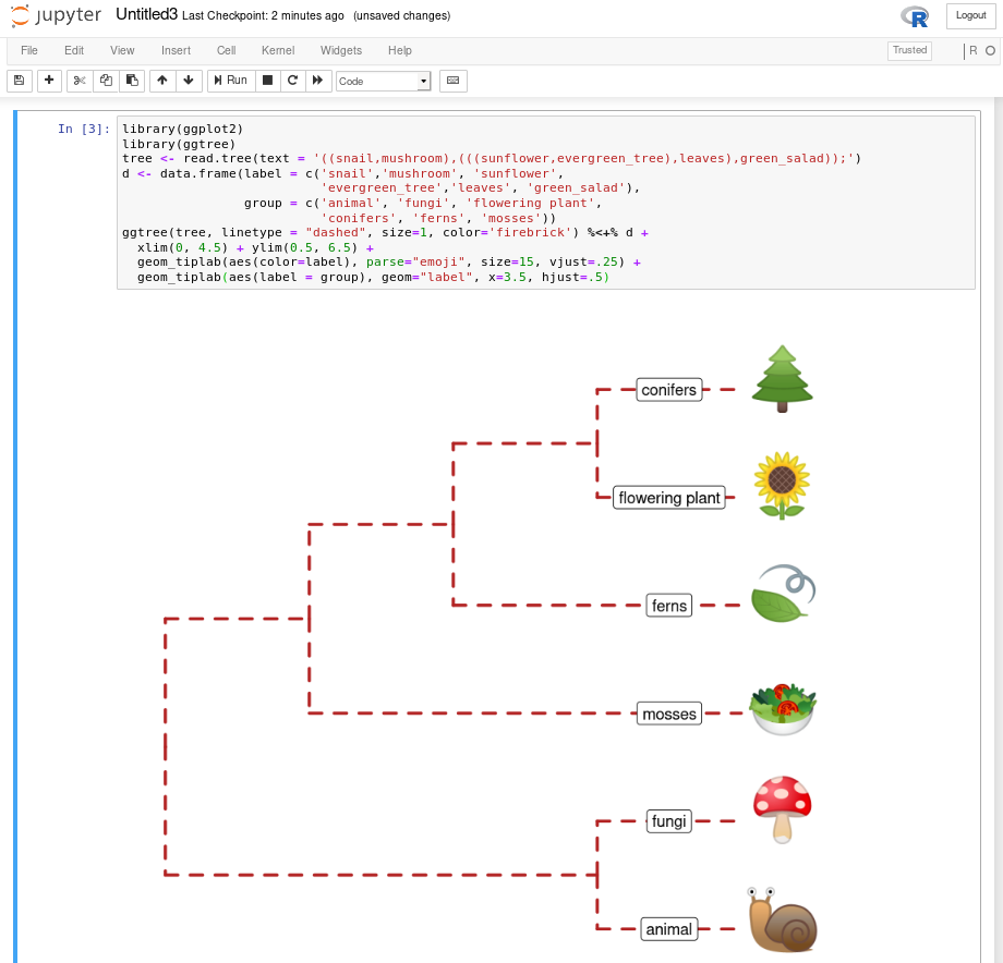 IRkernel::installspec()Then you can use ggtree and other R packages in the Jupyter notebook (Figure Figure 16.7). Here is a screenshot of recreating Figure Figure 10.5 in the Jupyter notebook.