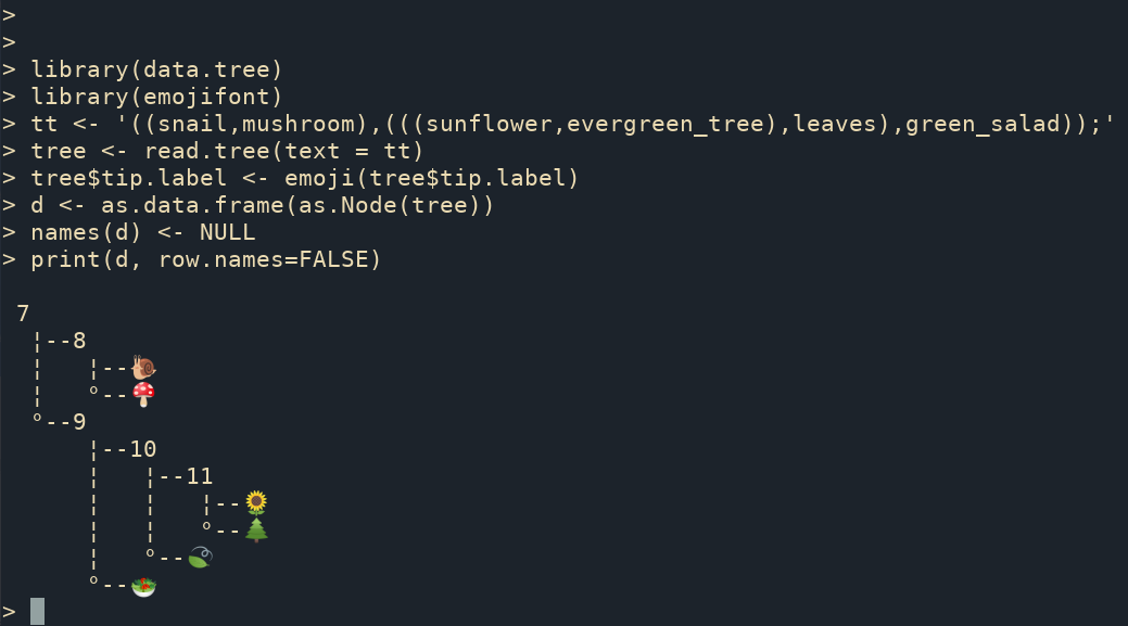 The ggtree supports parsing tip labels as emoji to create phylomoji. With the data.tree and emojifont packages, we can also print phylomoji as ASCII text (Figure Figure 16.3).