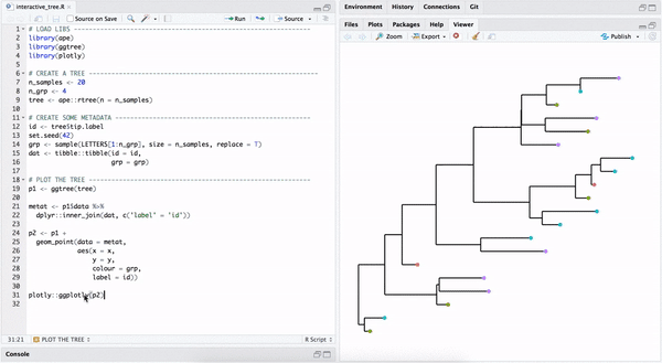 library("yulab.utils")One way to make a quick interactive phylogenetic tree is using ggtree with the plotly package. The ggplotly() is able to convert ggtree object to a plotly object. Note that the ggtree package also supports interactive manipulation of the phylogenetic tree via the identify() method.