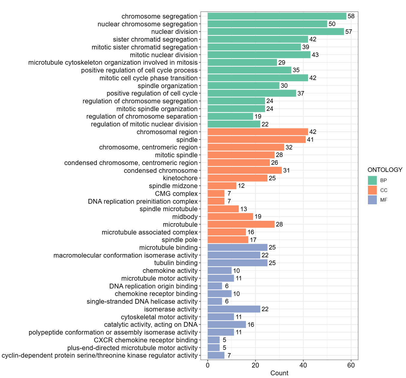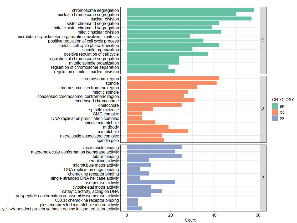 它会按 ONTOLOGY 自动把图拆成三块面板(通常是 BP/CC/MF),并且因为 scales = "free",每个面板会按自己的条目数量和标签长度去排版,不会互相“拖累”。
