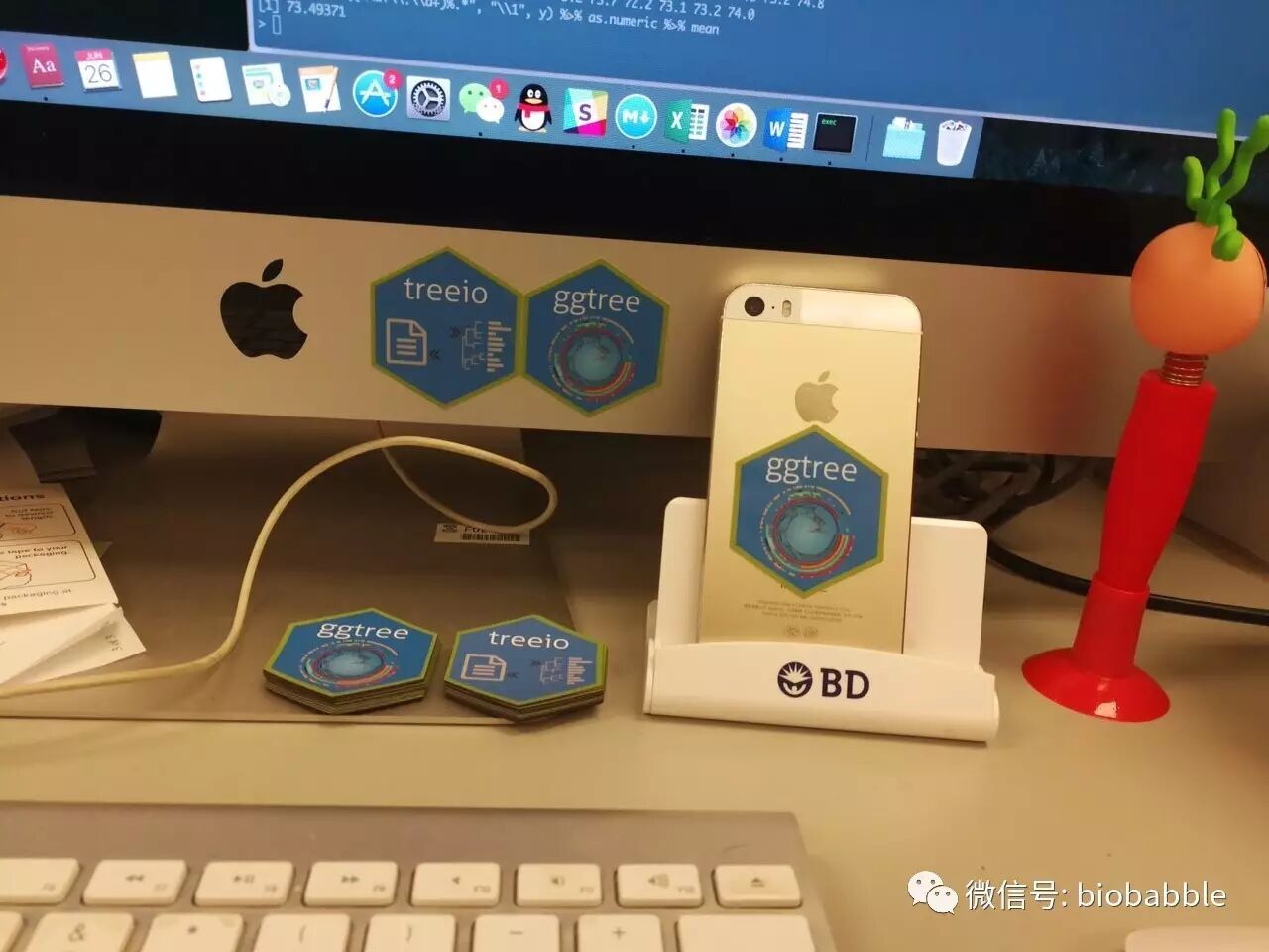 还记得《ggtree hex sticker》一文吧?画了几个六角贴,纯代码生成。时隔半年,原来的ggtree已经分成了treeio和ggtree两个包,而我也做了这两个包的六角贴,终于我花了289美元印了一大波贴纸+磁贴。