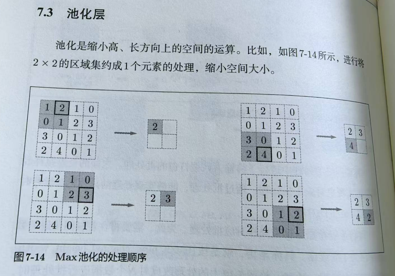 池化没有需要学习的参数,就是在目标区域里取个代表性的值,上图是最大值,也可以是平均值。池化是在每个通道单独进行,所以不会改变通道数。