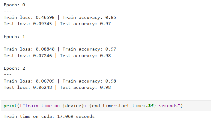 model = MNIST(input_shape=1, hidden_units=10, output_shape=10).to(device)还有相应的损失函数和优化器等:
