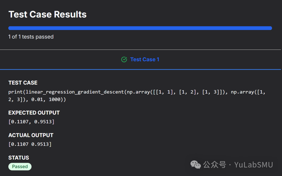 X = np.array([[1, 1], [1, 2], [1, 3]]), y = np.array([1, 2, 3]), alpha = 0.01, iterations = 1000 - Output: