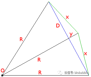 比如上面这个图,蓝色这条线长度为D,是多边线的边,现在在它中间一切为二,现在我们要求新的边x的长度。蓝色的一半是d=D/2, 新的顶点到蓝色线是y,里面那段是h = R-y。