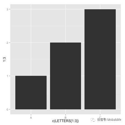 ggplot()+geom_bar(aes(x=c(LETTERS[1:3]),y=1:3), stat="identity")
