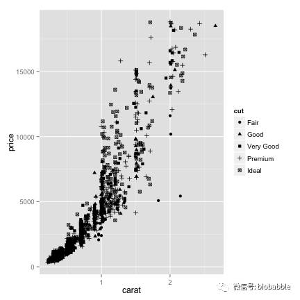 p <- ggplot(data=small, mapping=aes(x=carat, y=price, shape=cut))