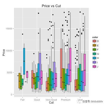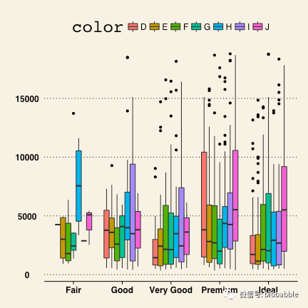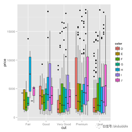 geom_boxplot将数据映射到箱式图上,上面的代码,我们应该很熟悉了,按切工(cut)分类,对价格(price)变量画箱式图,再分开按照color变量填充颜色。