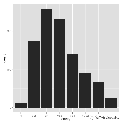 柱状图非常适合于画分类变量。在这里以透明度(clarity)变量为例。按照不同透明度的钻石的数目画柱状图。