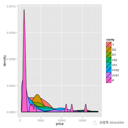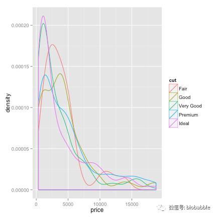 在这个文档里,为了作图方便,我们使用diamonds数据集的一个子集,如果使用全集,数据量太大,画出来散点就糊了,这种情况可以使用二维密度力来呈现。