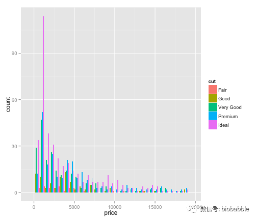 ggplot(small)+geom_histogram(aes(x=price, fill=cut), position="dodge")