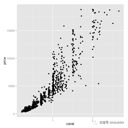 画图实际上是把数据中的变量映射到图形属性上。以克拉数为X轴变量,价格为Y轴变量。