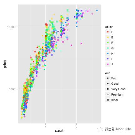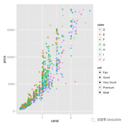 p+geom_point(aes(x=carat, y=price, shape=cut, colour=color))