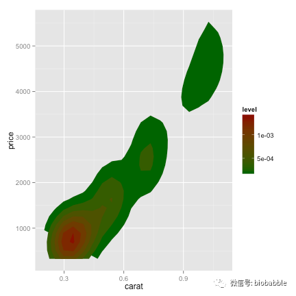 ggplot(diamonds, aes(carat, price))+ stat_density2d(aes(fill = ..level..), geom="polygon")+ scale_fill_continuous(high='darkred',low='darkgreen')