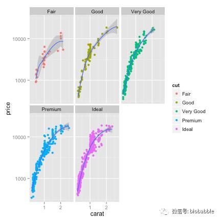 在统计变换一节中,提到如果按切工分组作回归线,显然图会很乱,有了分面功能,我们可以分别作图。