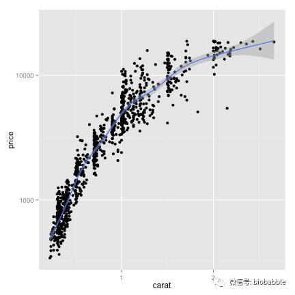 这里就不按颜色、切工来分了,不然ggplot会按不同的分类变量分别做回归,图就很乱,如果我们需要这样做,我们可以使用分面,这个将在后面介绍。