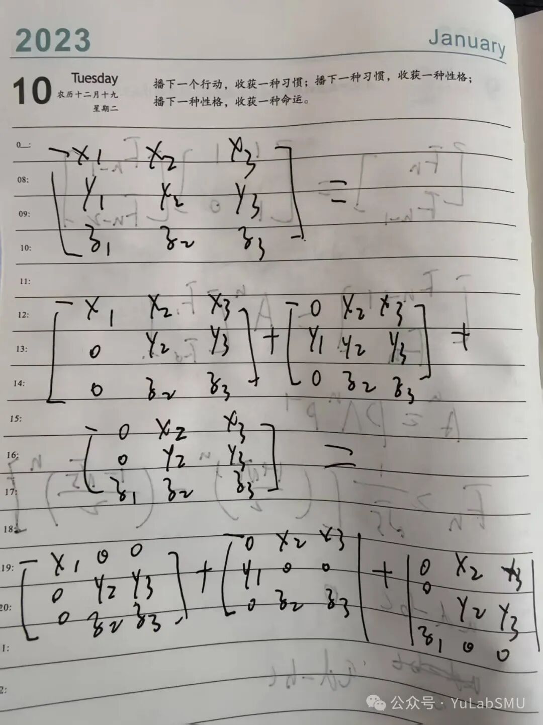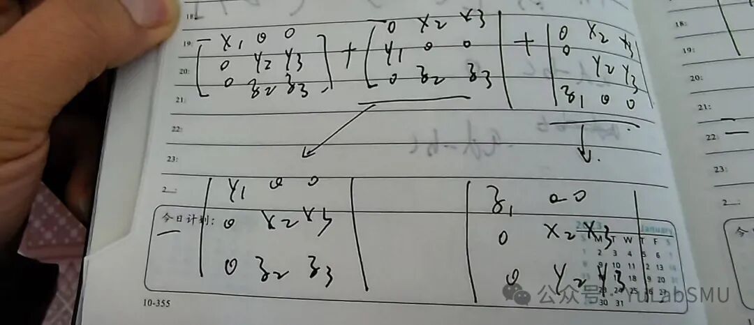 最后这三个矩阵呢,我们要对它进行平移,第一个矩阵不用平移,第二个矩阵平移一次,乘以-1,第三个矩阵平衡两次,乘以两次-1。这个乘以-1是由行列式的反对称性决定的。