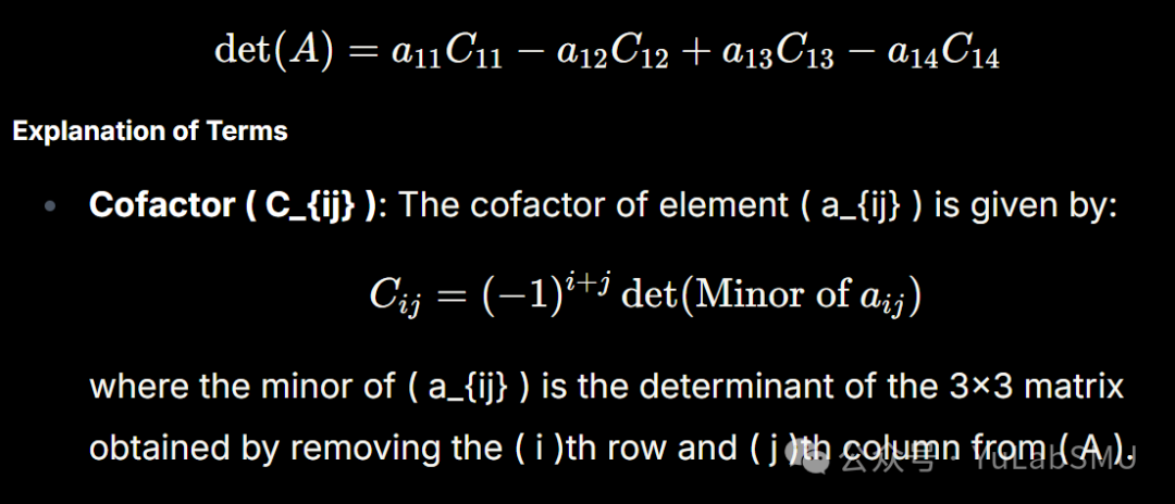 也就是随意选一行或一列,然后它可以展开为这一行(列)的元素,乘以去掉这一行(列)和任意一列(行)得到的cofactor的总和。而这个cofactor是相应的(n-1)方阵的行列式再乘以1或-1,也就是说它是带有方向的。
