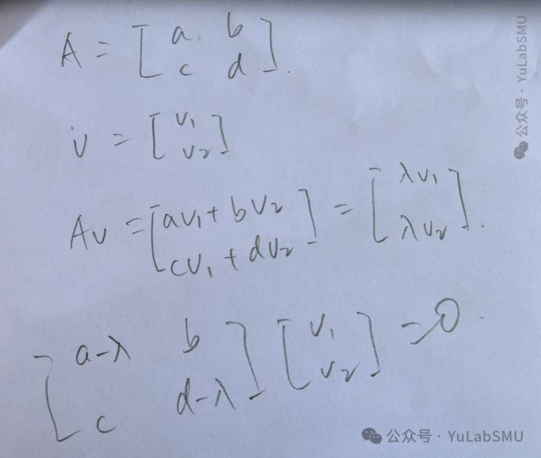 A是一个矩阵(这里2x2),它的特征向量v就是经过A的线性变换后,方向是不变的,也就是 Av =λv,其中λ是一个标量,而λ就是特征值。