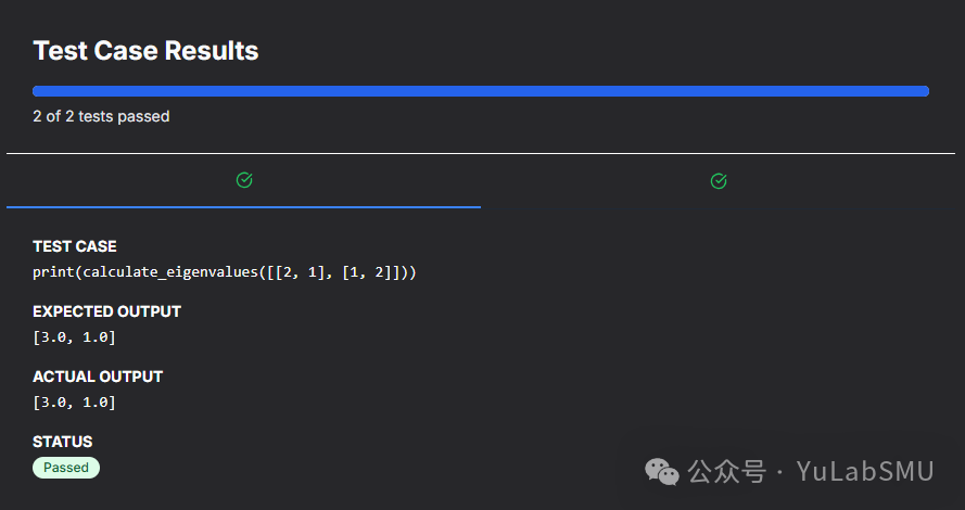 所以这道题,就变成了写一个函数算矩阵的迹(trace,对解线的和)和行列式(determinant)。然后用它们一算,一元二次方程的参数就有了,直接套公式,就可以出特征值了。