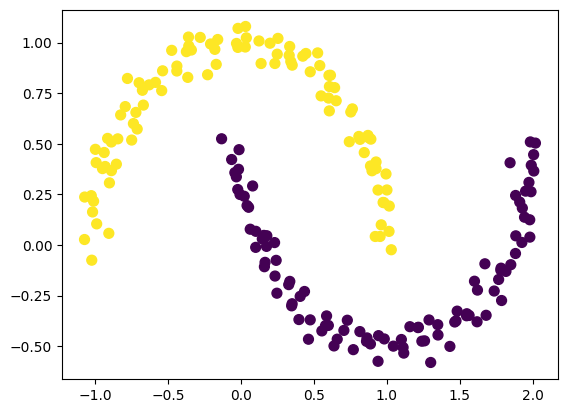 plt.scatter(X[:, 0], X[:, 1], c=y_spectral, s=50, cmap='viridis')这里我就用了affinity='rbf'也就是高斯核函数,gamma这个参数控制高斯核函数的宽度,数据复杂的情况下,gamma就可以调大一点试试。最后的聚类结果效果就非常好。
