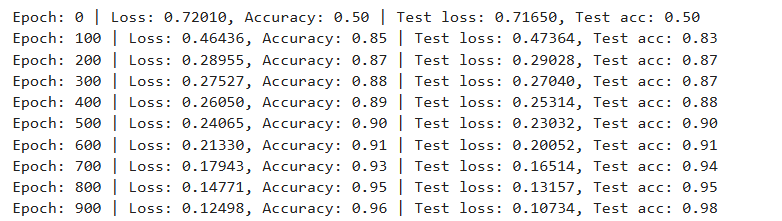 print(f"Epoch: {epoch} | Loss: {loss:.5f}, Accuracy: {acc:.2f}% | Test loss: {test_loss:.5f}, Test acc: {test_acc:.2f}%")