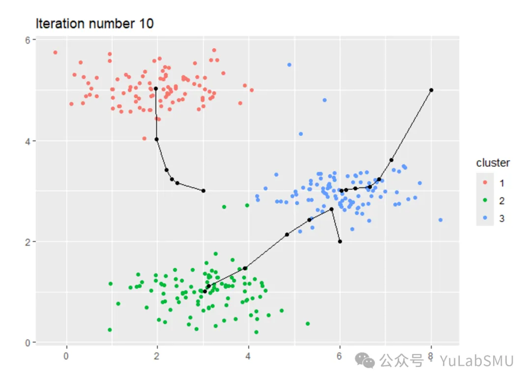自己写的一个好处是你可以记录一下迭代过程中的中心点位置,然后拿来画图,对于KMeans的过程会有直观的感受,你也会发现收敛得很快。这就是我在2011年的时候用R写的代码出的图: