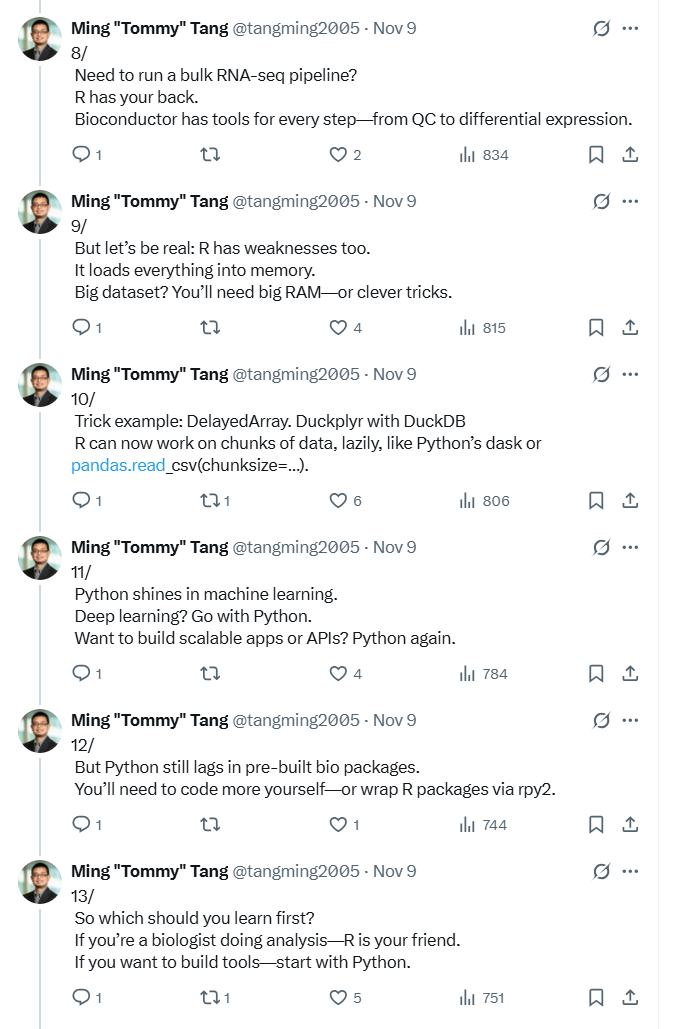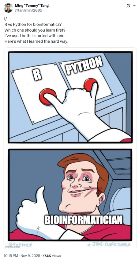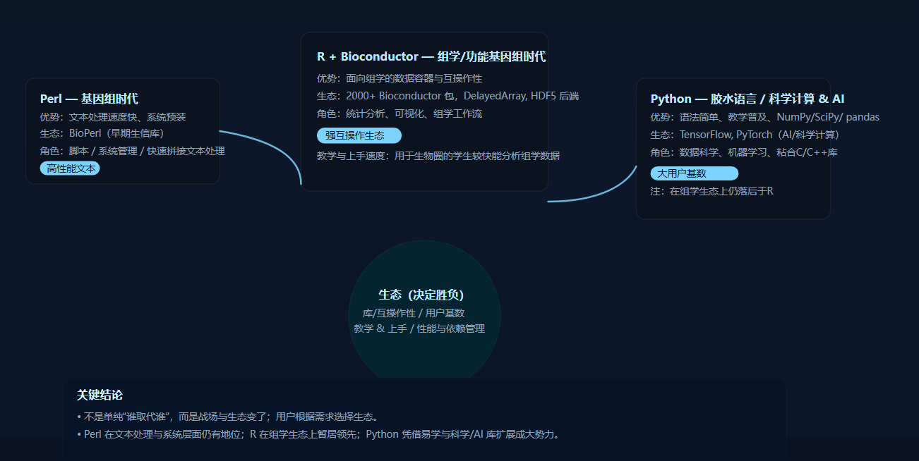 于是我会更愿意把它说成:虽然大家口头上说“Python 取代了 Perl”,但在生物信息学里,很多时候更像是用户从 Perl 的主场,整体迁移到了 R 的主场;而 Python 则在更大的科学计算与工程生态里,成为了更强的“胶水语言”。