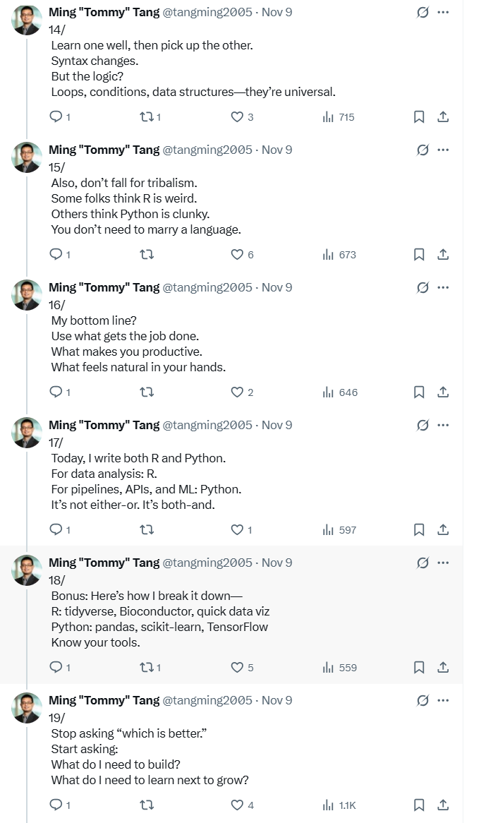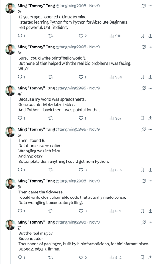 生态的构建,一方面需要少数人把地基搭好,另一方面需要大量用户把真实场景填进去。一个时代有一个时代的需求,也会造就一个时代的英雄。Perl 是旧时代的英雄;R 在组学时代影响力巨大;Python 则在更广阔的科学计算与 AI 时代加速扩张。至于未来谁会更强,看需求怎么变,也看生态怎么长。